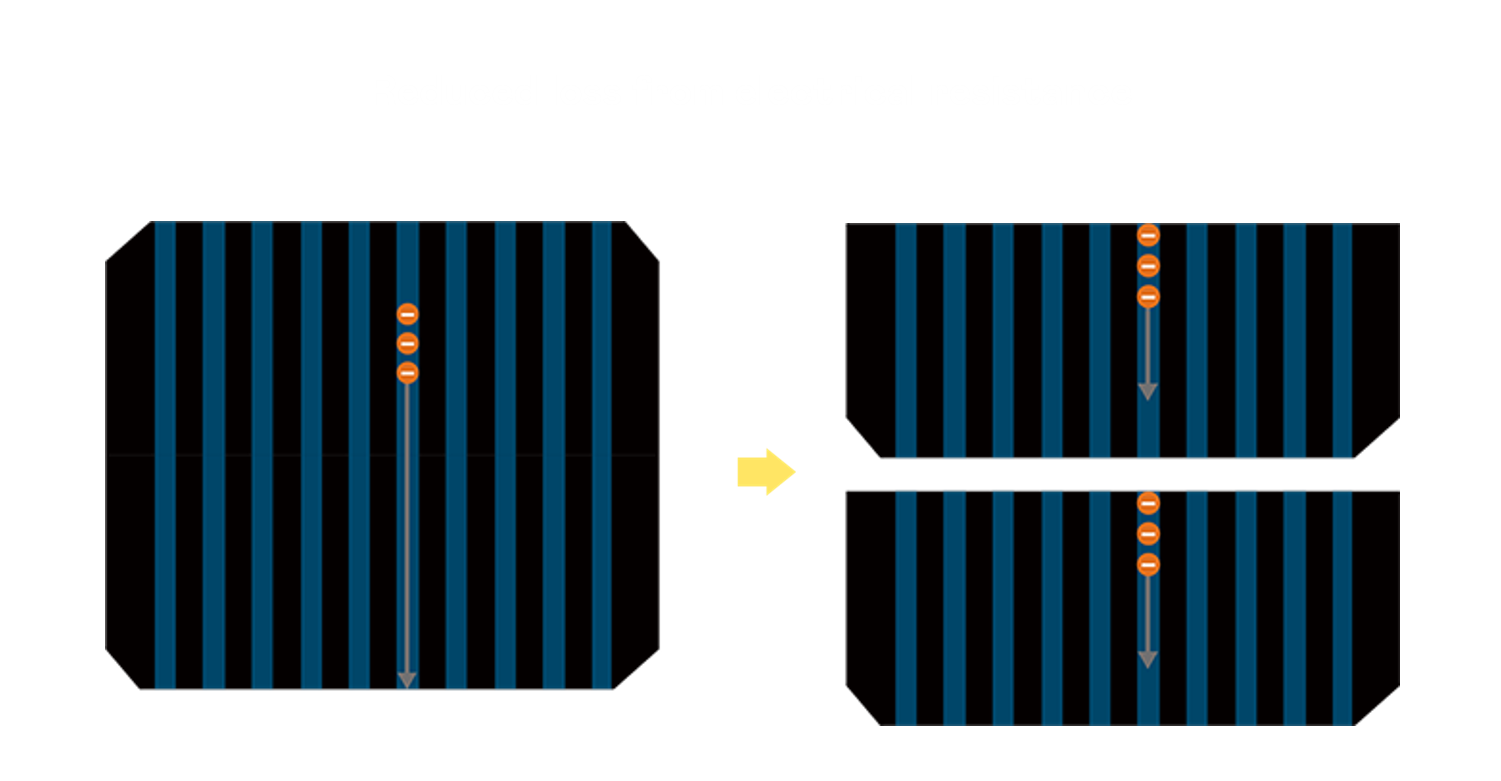 • 結合半切電池,降低遮陰影響、提升模組抗隱裂能力、並減少電阻損耗,進一步提升模組發電效能。